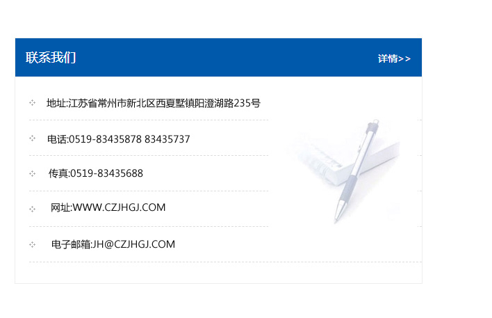 地址:常州市新北區(qū)友邦商務(wù)大廈1幢16、17層  電話:0519-85101652  傳真:0519-85112595  郵編:213022  網(wǎng)址:www.cz-jiayue_cn.dazeal.net  郵箱:xiajifengaa@163.com
